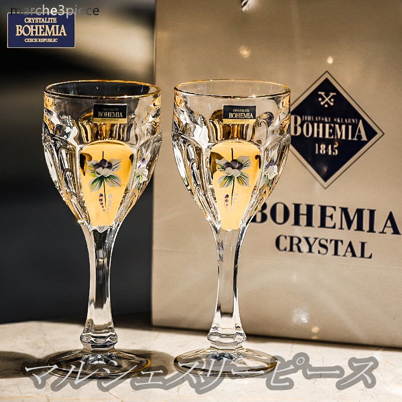 - チェコ輸入 高級ステムワイングラス 手描き金 2個セット ギフトボックス入り