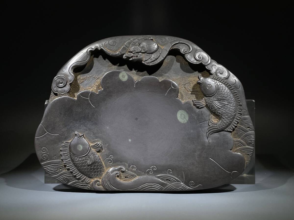 - ◆珍蔵◆中国古美術 清代 老坑石 細密彫刻 正宗年年有魚 端渓硯 古墨 文房具 置物 擺件 古賞物 骨董 時代物 A13