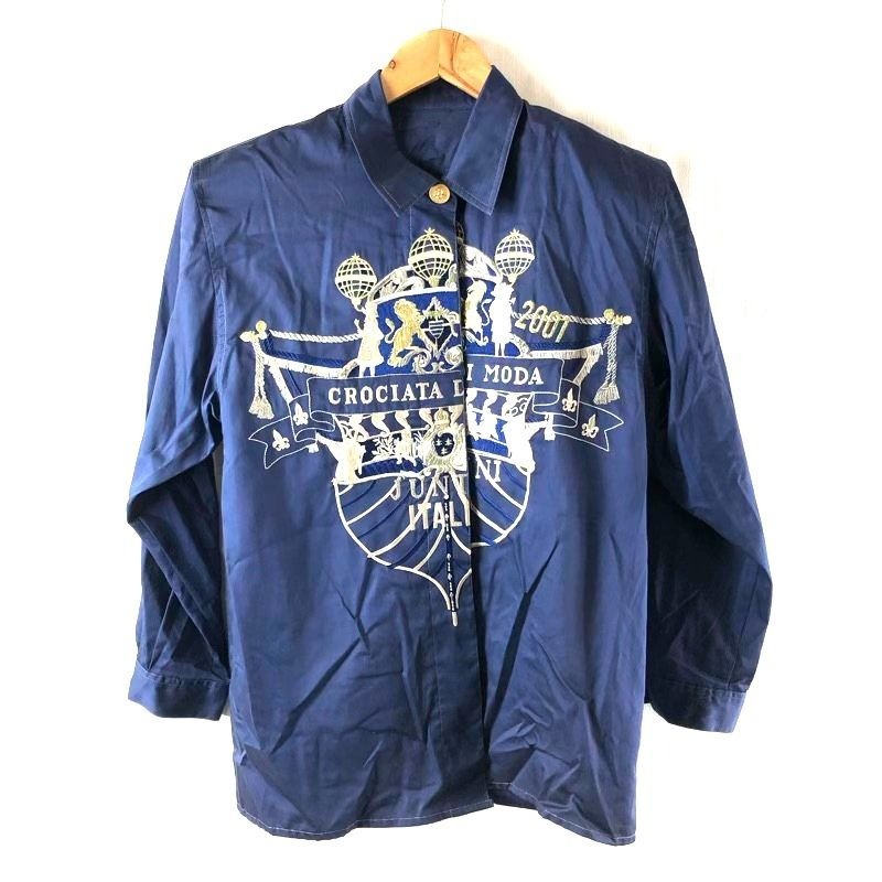 - シャツ 長袖 刺デザイン ビジュー ゴールドボタン 肩パッド ネイビー 2025082800292