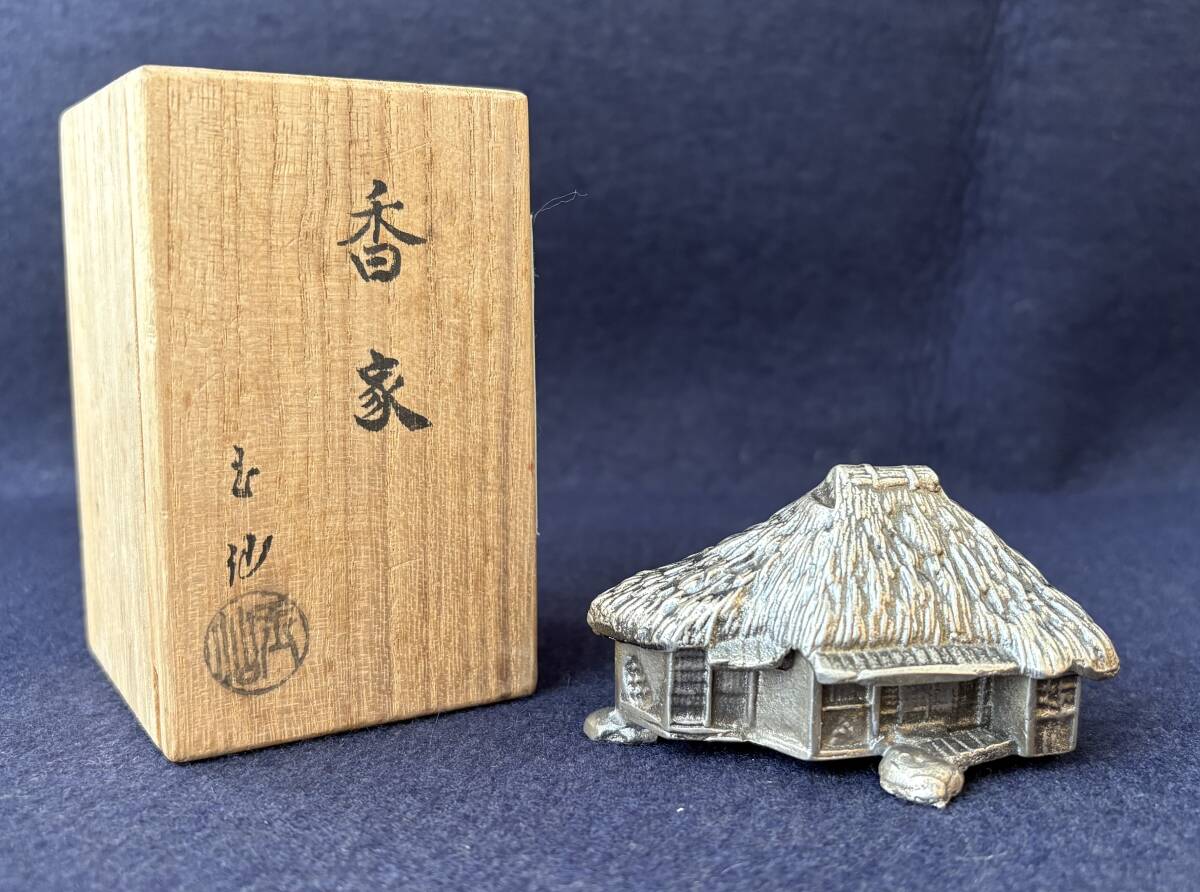 - 香炉 香家 「玉仙」 家型 銀色 茅葺き屋根の家 共箱 玉仙作 置物 金属工芸 アンティーク ミニチュア フィギュリン 金工