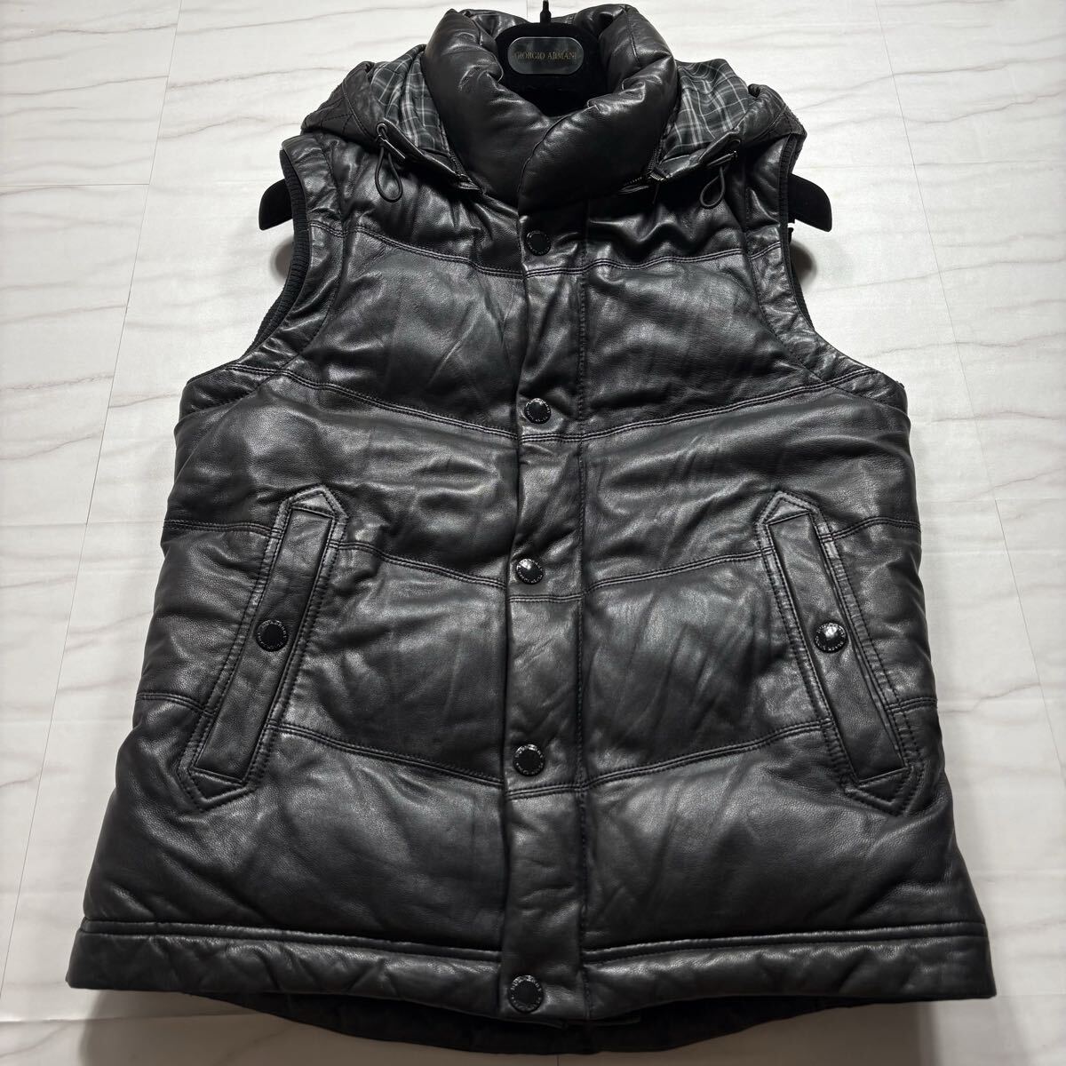 - 極上羊革/M◎バーバリーブラックレーベル ラムレザー ダウンベスト ノバチェック ジャケット フード着脱 BURBERRY BLACKLABEL メンズ 黒