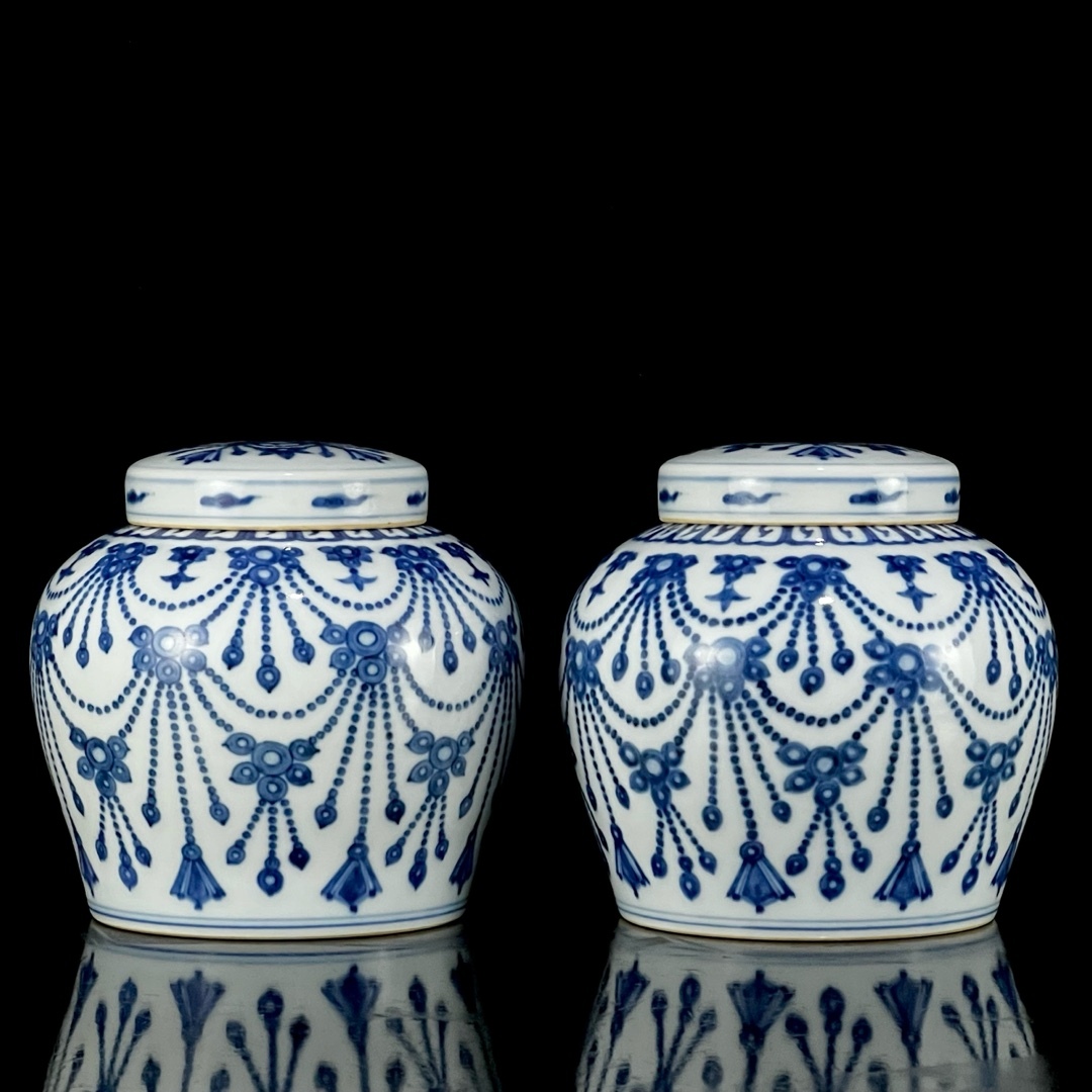 - 明時代 成化年製款 古陶磁器 青花 瓔珞紋 天字罐 一対 文案置物 磁器 陶芸 擺件 時代物 古董品 骨董 旧家蔵出し 唐物 中国古玩 古美術品