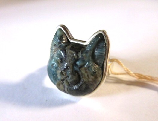 ブルーグリーンのグランディディエライトの猫のカービングのリングです。透明感はあまりなく、ライトを当てますと、耳の部分に透過性があるのがわかります。非加熱。