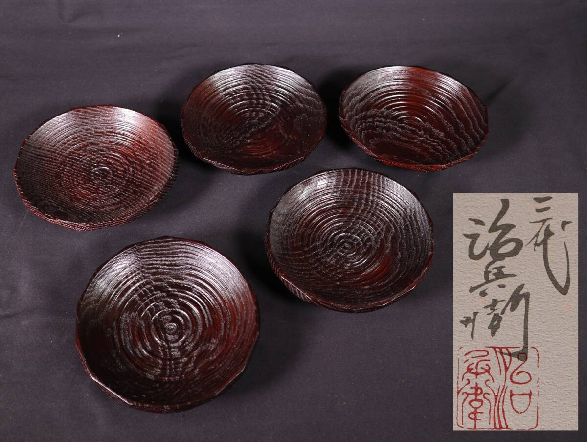 - 三代 村瀬治兵衛 作 木木造 漆塗 茶托 5客 紙箱付・銘々皿 煎茶道具