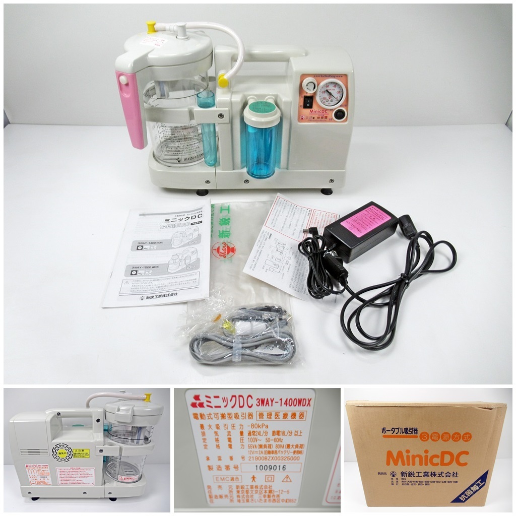 - ◆[C22]ポータブル吸引器 MinicDC 3WAY-1400WDX 3電源方式 抗菌加工 新鋭工業株式会社 取扱説明書・元箱付き 動作確認済