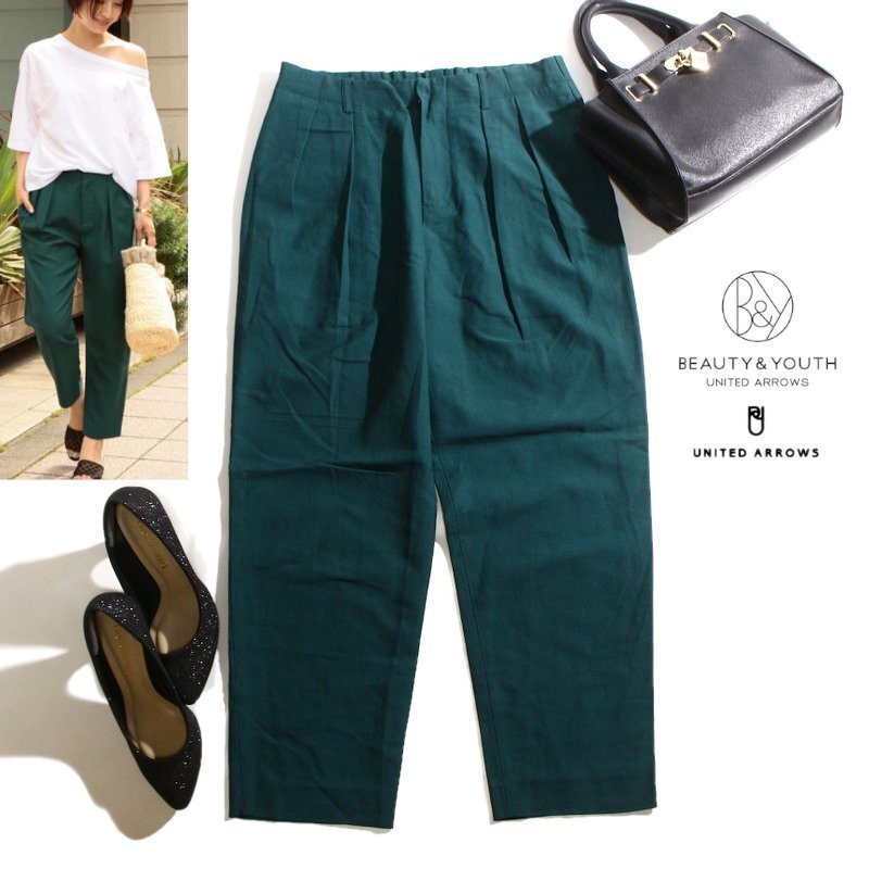 - 美品 ビューティ&ユース BEAUTY & YOUTH ユナイテッドアローズ UNITED ARROWS ツイル Wタック 9分丈 テーパード パンツ グリーン 緑 M
