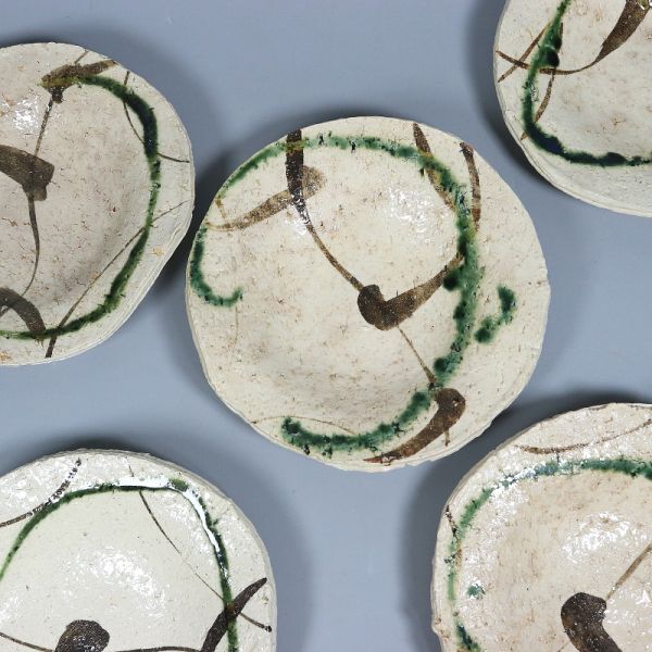 - 218■岸本謙仁 「草紋 丸皿 五客」 共箱 美濃の里 日本工芸会正会員・認定 茶道具