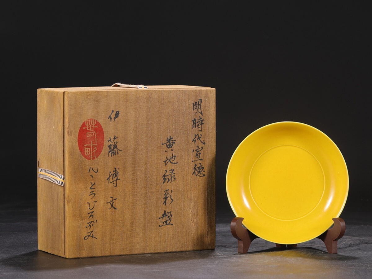 - 「明 宣徳年製 陶磁器 黄地緑彩 盤」染付 置物 擺件 古賞物 中国古美術 旧蔵出