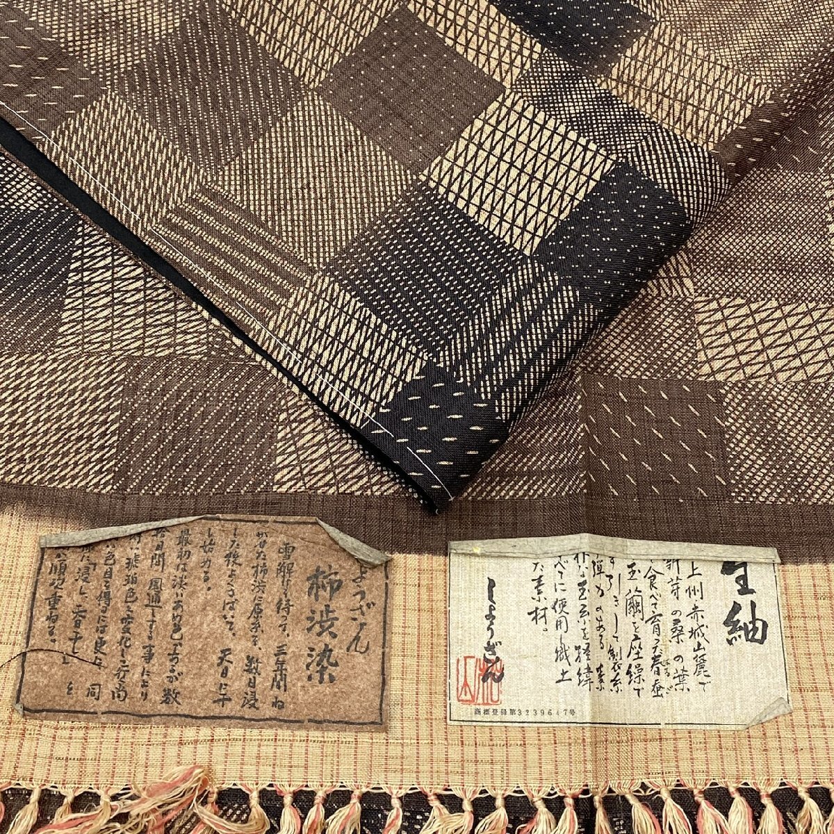 > 着物月花 しょうざん 柿渋染 市松文様 生紬 未使用品 正絹 参考上代504,000円 ki5958