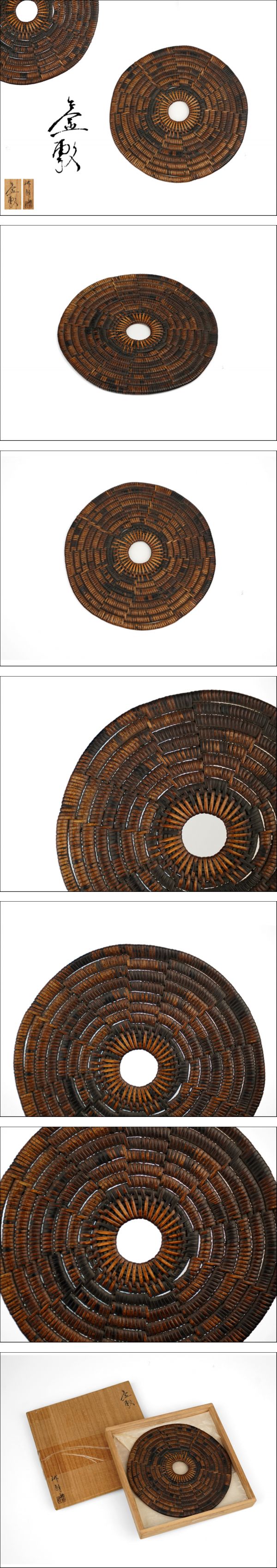 - 【簡】時代 鈴木 竹朋斎 作 圓式 籐編 瓶敷 共箱(検 煎茶道具 釜敷 急須台 急須盆 藤組 竹細工 竹組 竹編 網代編 竹雲斎 鉄瓶 瓶座 瓶床)