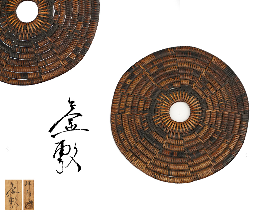 > 【簡】時代 鈴木 竹朋斎 作 圓式 籐編 瓶敷 共箱(検 煎茶道具 釜敷 急須台 急須盆 藤組 竹細工 竹組 竹編 網代編 竹雲斎 鉄瓶 瓶座 瓶床)