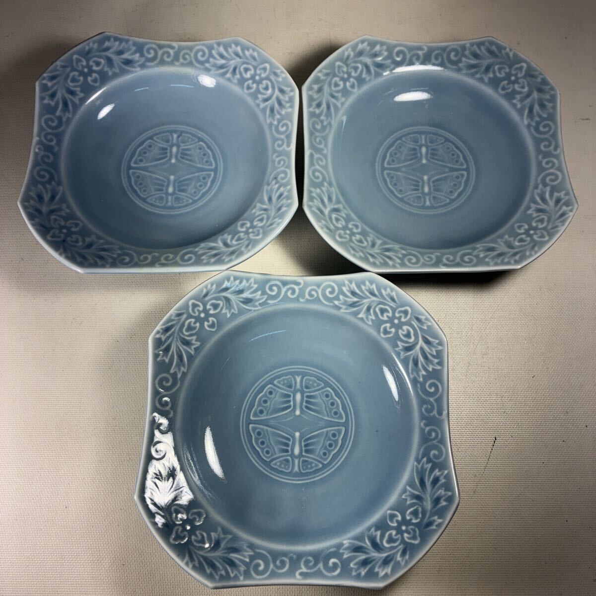 - 古鍋島 青磁 花 蝶 四方皿 3客 14.3cm