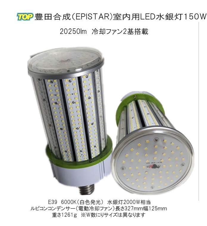 - LED水銀灯 室内用 トヨタ合成(エピスタ)LED水銀灯(コーン型)電動冷却ファン付き 結露防止カバー 150W E39 20250lm 6000K(白色)
