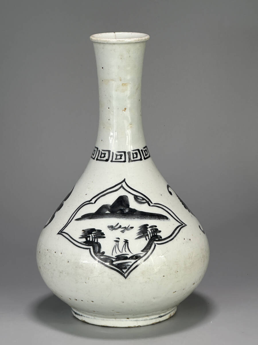 - 1US17 韓国美術 李朝時代 李朝 白磁 青花開窓風景文長首瓶 花瓶 花器 唐物 古物