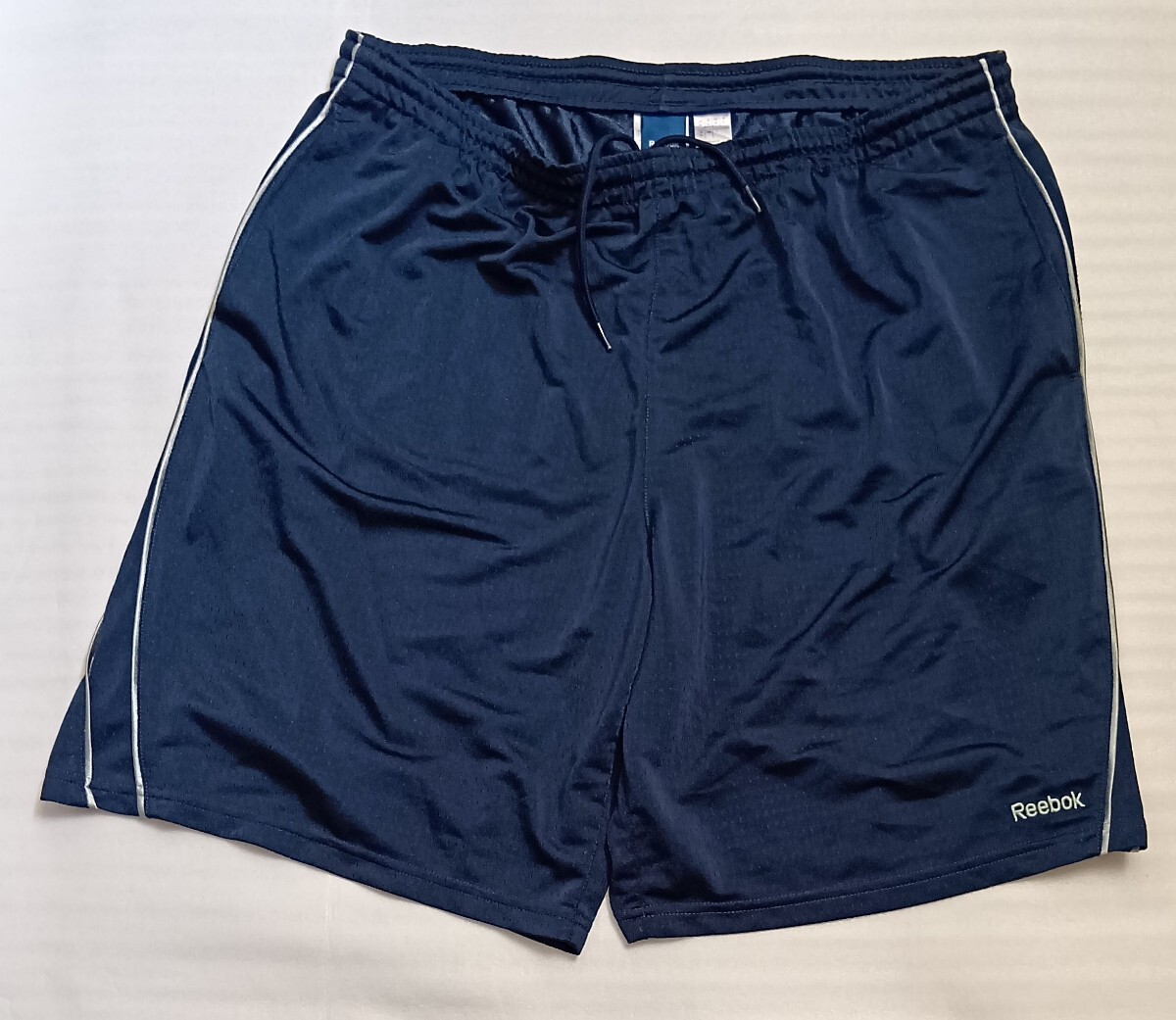 > Reebok.COM☆サイズXLショート短パンツ半ハーフ紺色ネイビー刺繍文字ズボン メッシュ ボトムス スポーツ ファッション ブランド リーボック