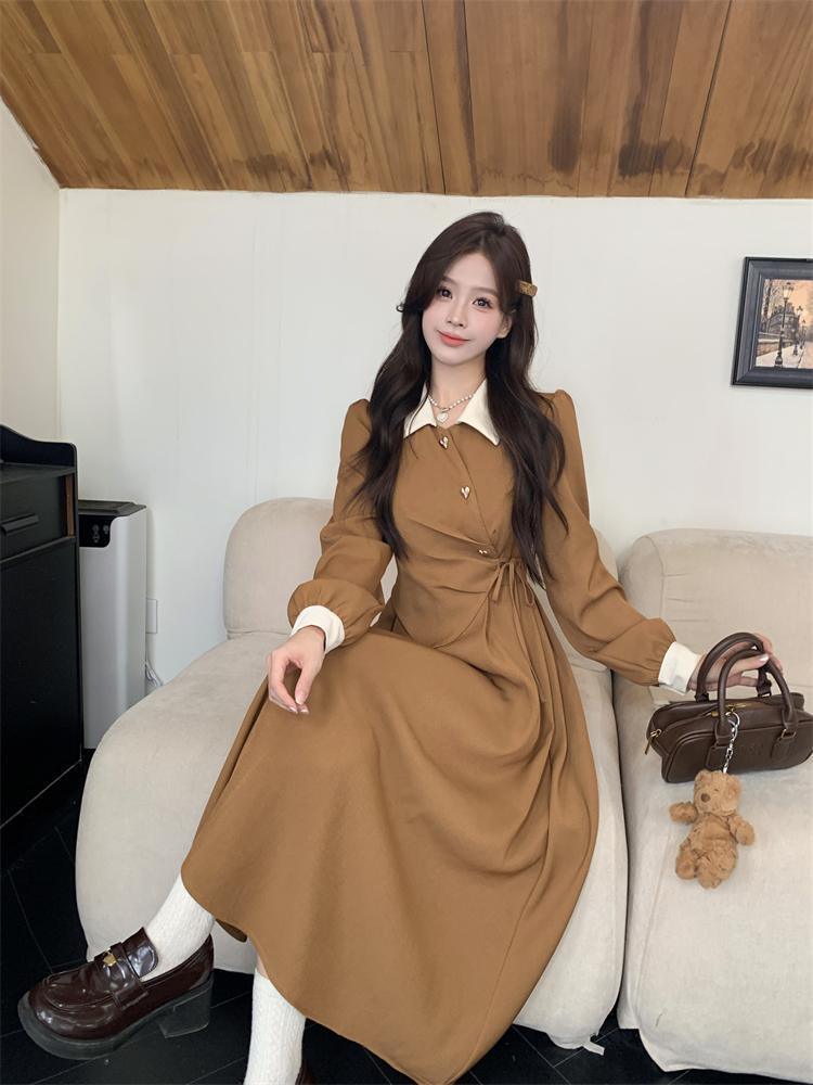 - 新品 大きいサイズ 3Lバイカラー ロングワンピース 秋冬ブラウン Aライン長袖