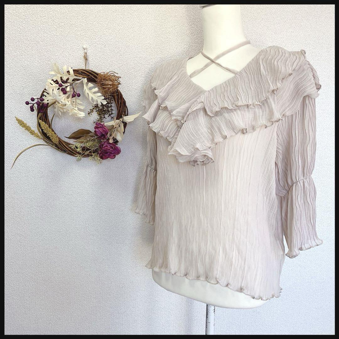 - ☆フェミニン☆シフォンプリーツブラウス フリル襟 シアー 透け感 グレージュ M