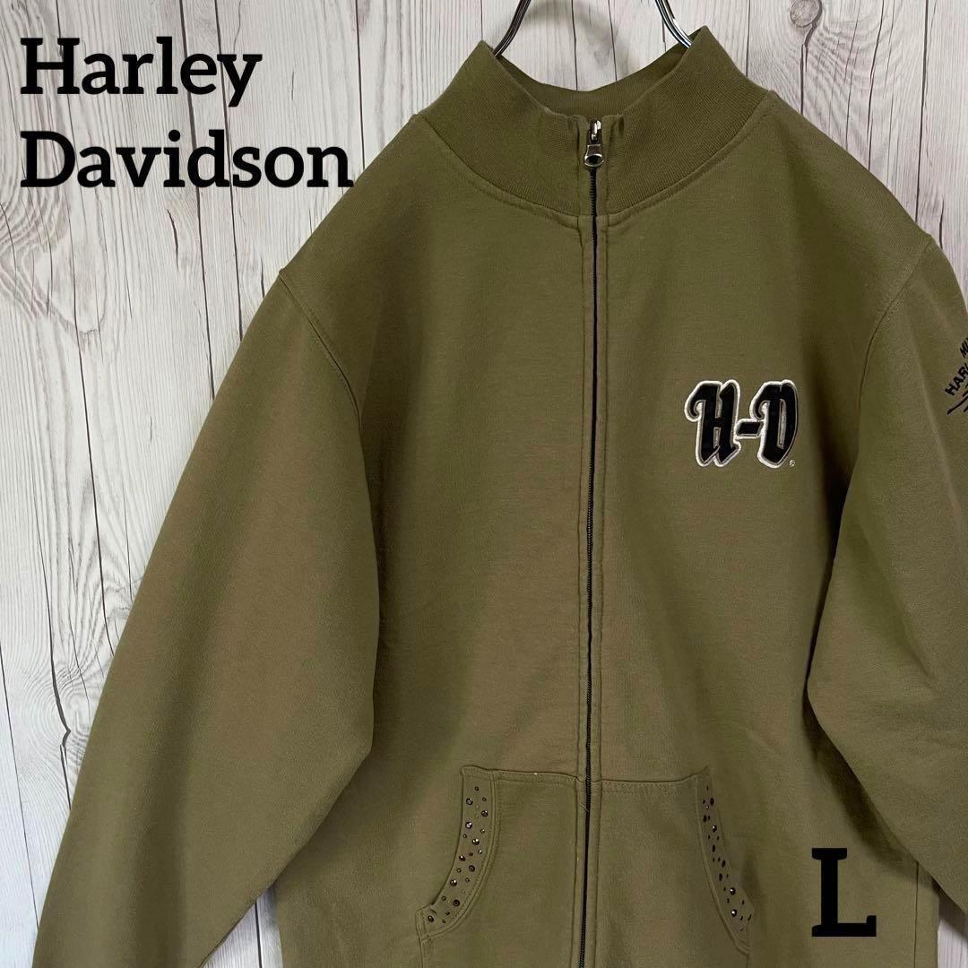 > Harley-Davidson ハーレーダビッドソン ジップアップ ブルゾンジャケット 刺繍 メンズLサイズ スウェット ジャンバ― カーキ 古着