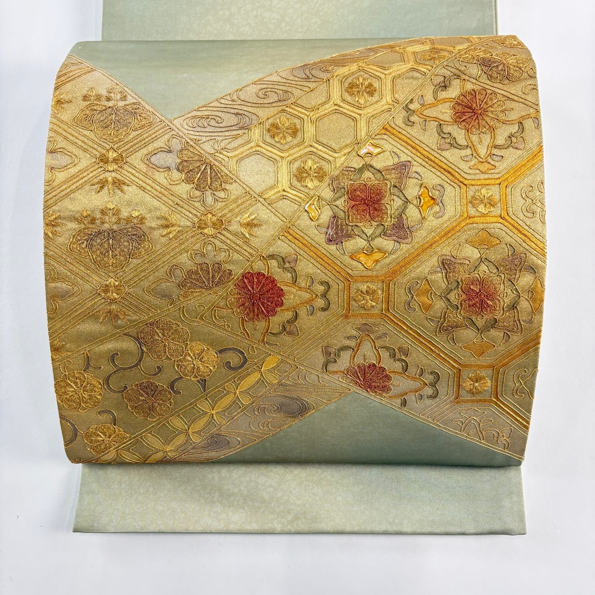 - 袋帯 秀品 関西仕立て 華文 亀甲 螺鈿 金彩 灰緑 お太鼓柄 正絹 【中古】
