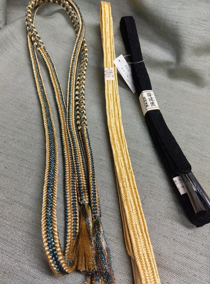 - 金の鈴 正絹 手組み帯締め 3本 深泥黒 クリームイエロー 金糸緑変わり組 和装小物 未使用
