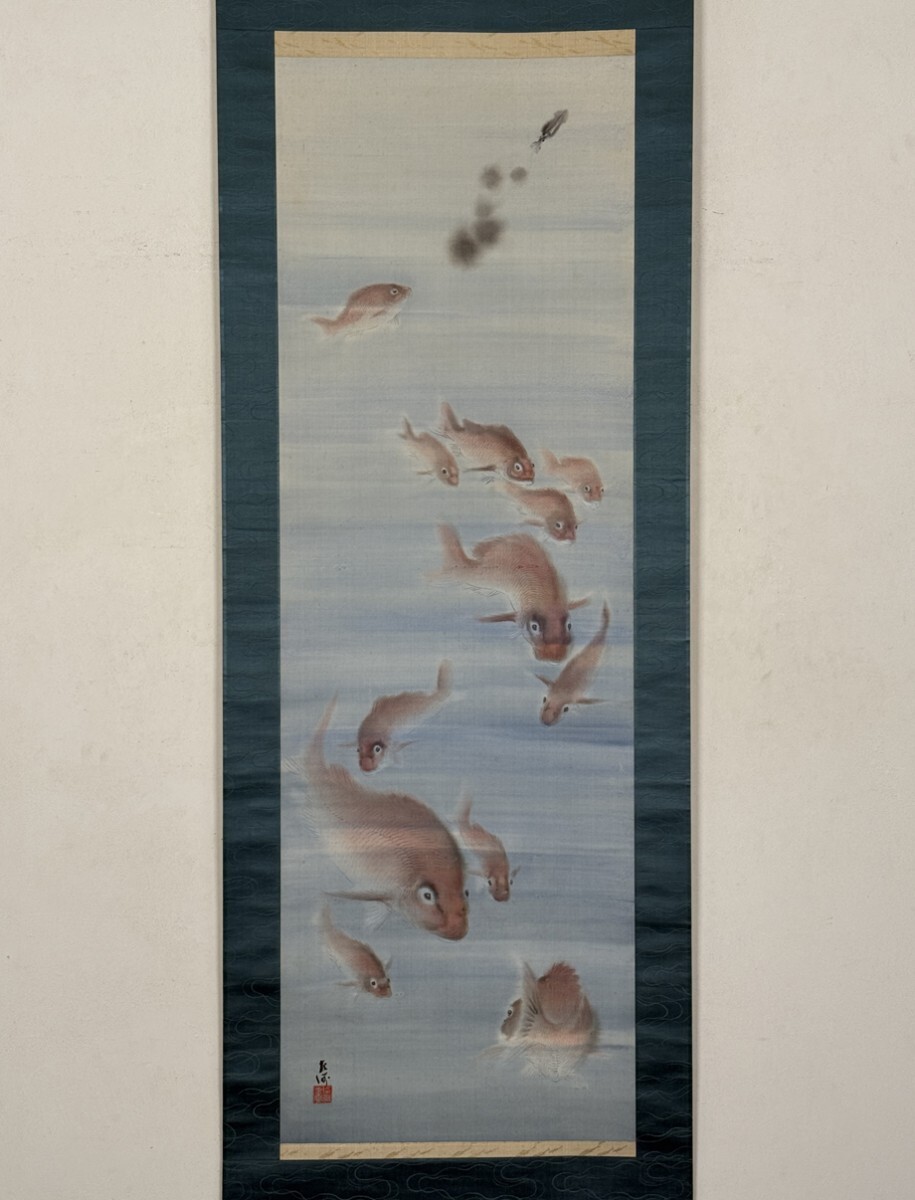 - 【真作 佳品】掛軸「中村左洲 群かれる鯛」大正10年48歳 共箱 二重箱 日本画家 磯部百鱗師事 四条派 鯛絵名手 三重県生 動物画 絵画