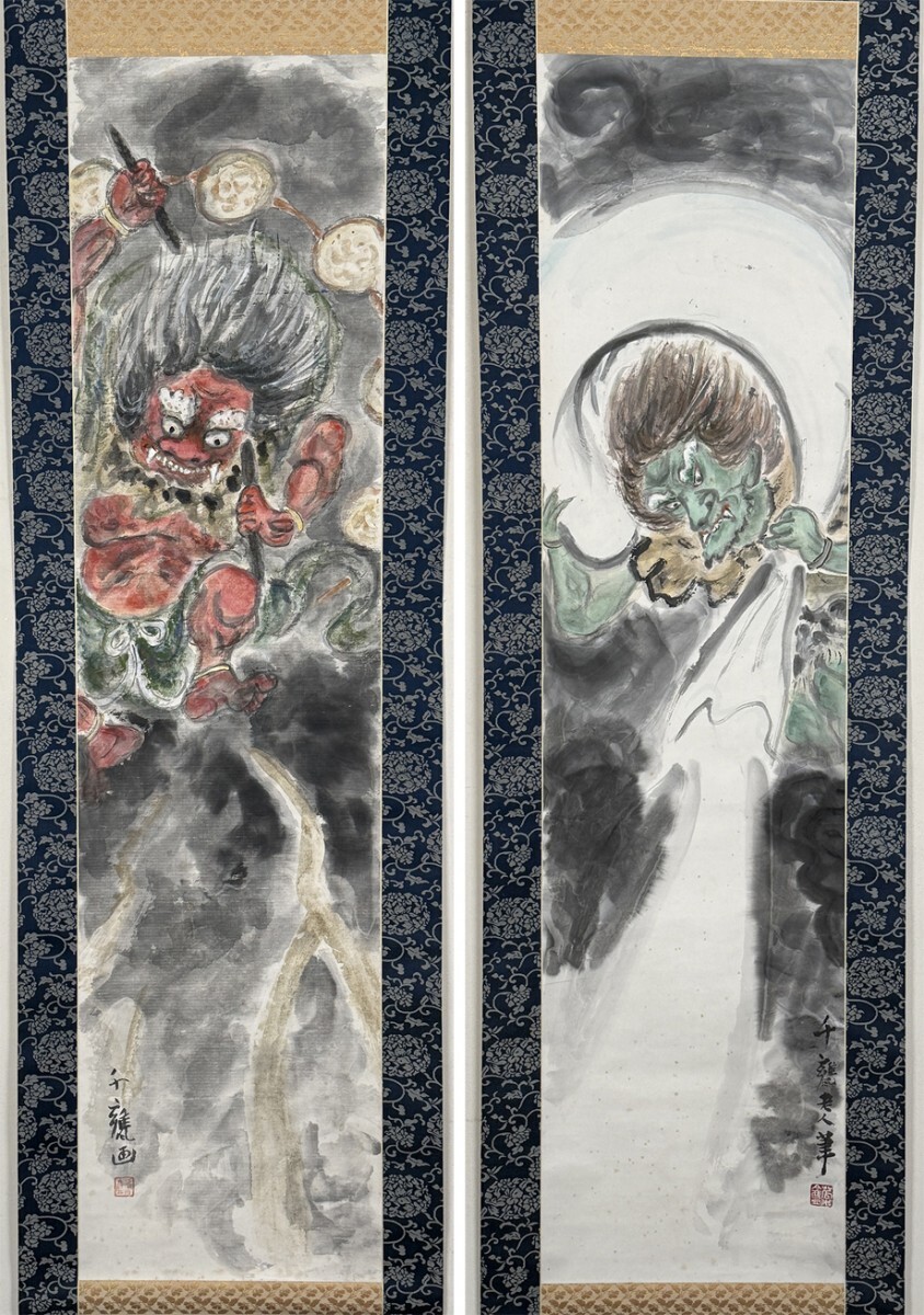 - 【真作 晩年作】掛軸「小川千甕 風伯 雷神 双幅」昭和45年89歳 共箱 北村敬重・浅井忠門下 絵画