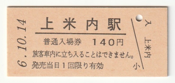 - 平成6年10月14日 山田線 上米内駅 140円硬券普通入場券(日付印刷)