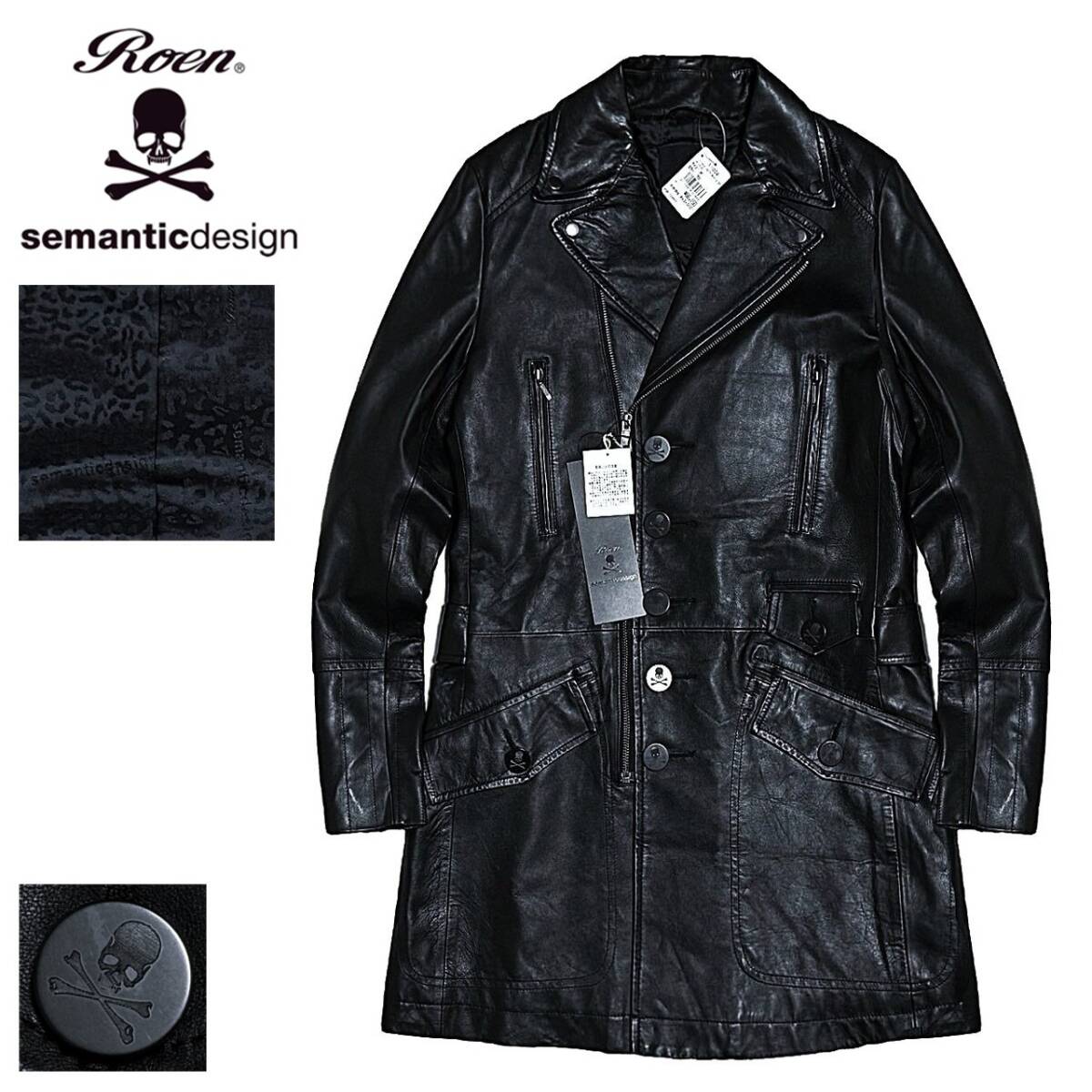 - 希少! Y2K 定価6.6万 新品 ロエン Roen x semantic design 羊革 スカルボタン 裏レオパード ラムレザー ライダースコート 黒 M ジャケット