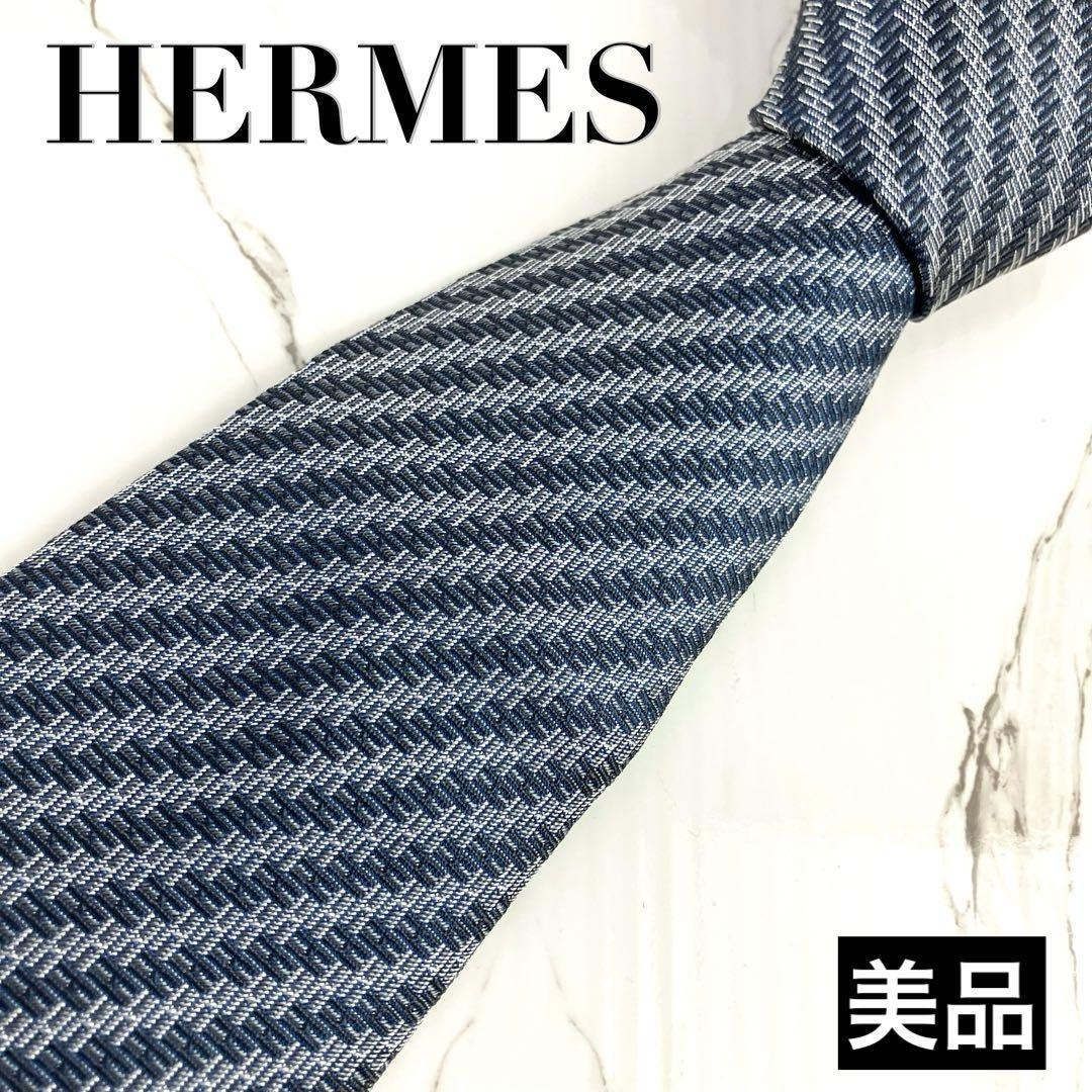 - 美品 HERMES エルメス ネクタイ H柄 ストライプ ジャガード ネイビー×シルバー