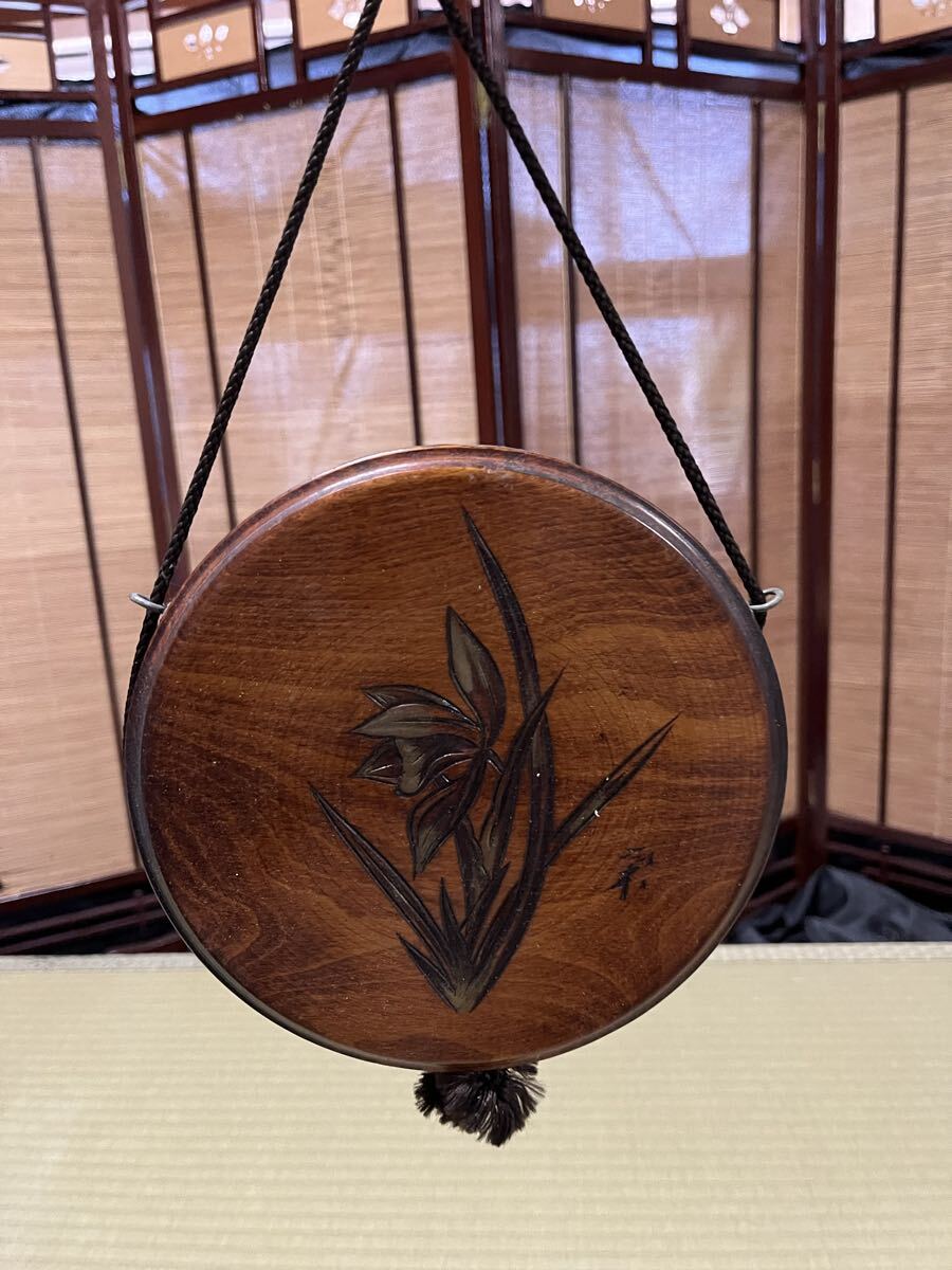 - 木製漆器 在銘 掛花入 一輪挿し 丸形 花器 華道具 天然木 紐付