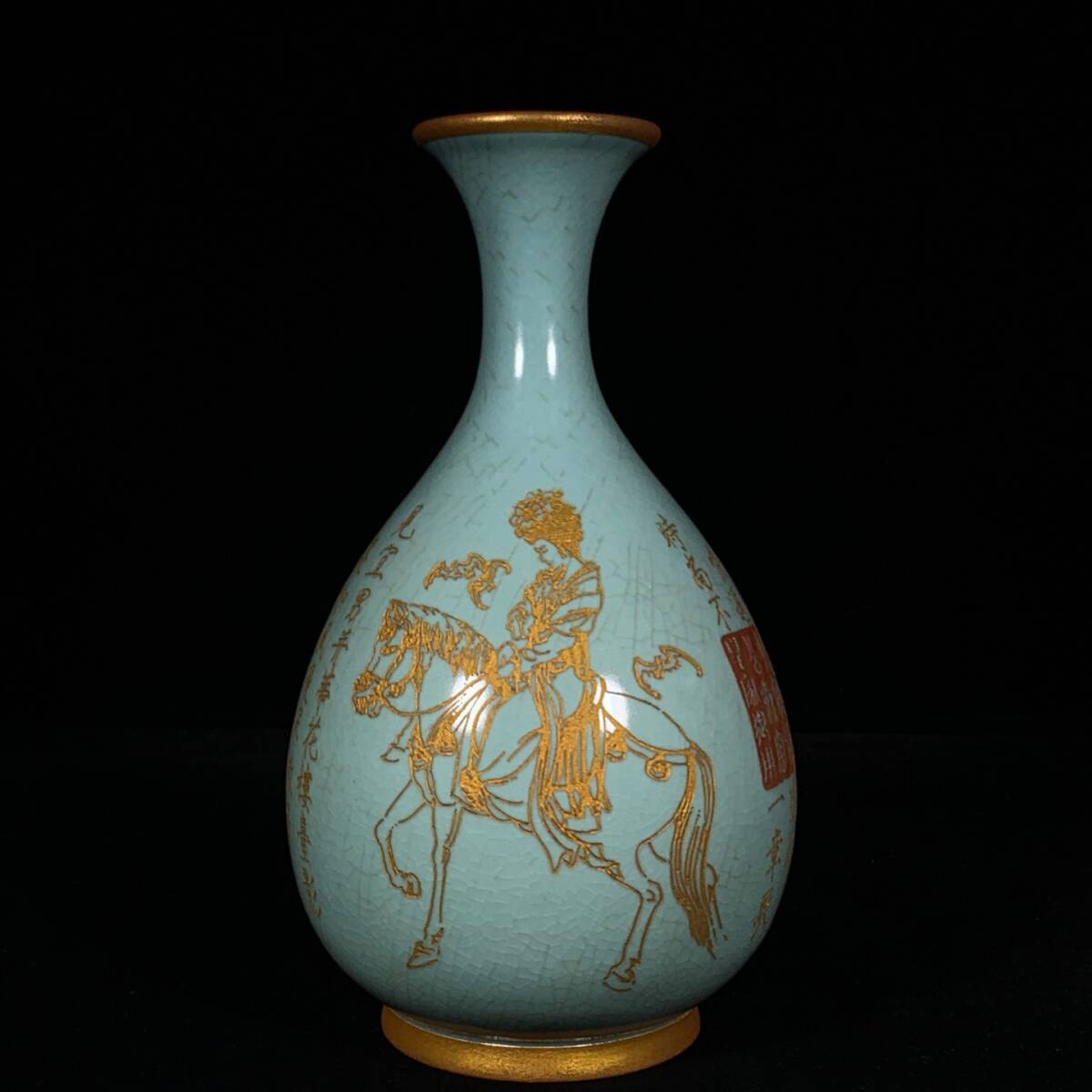 > ▽鴻▽ 宋 古陶瓷品 汝窯 包口 銘文仕女紋 玉壺春瓶 陶藝 古賞物 古董品 時代物 稀少珍品 中国古玩 中国古美術