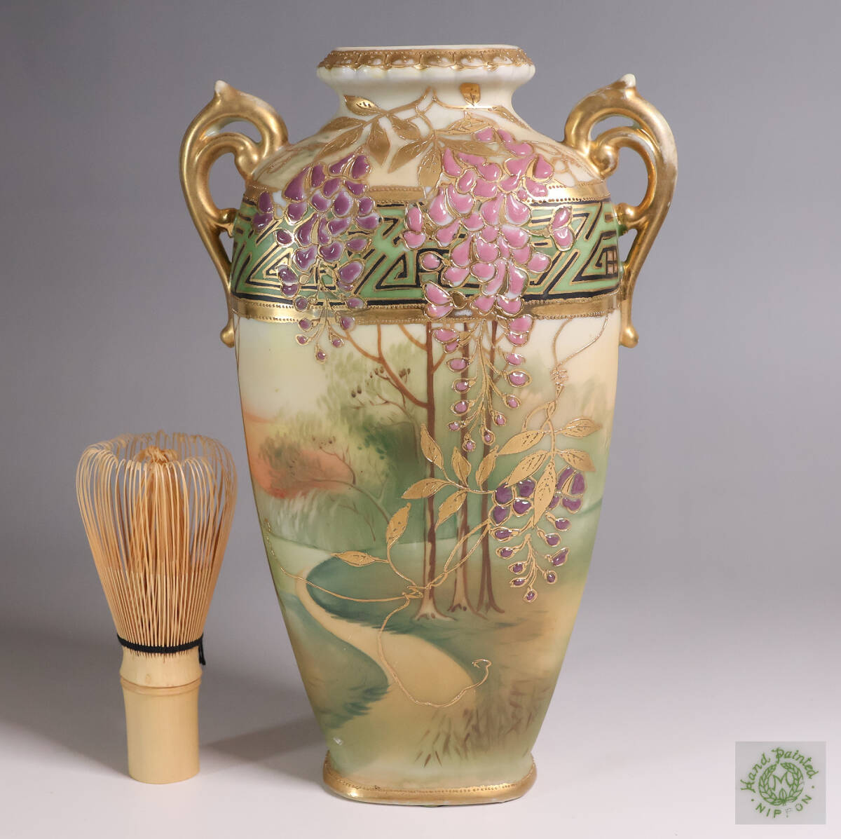 - 【CM326】訳あり オールドノリタケ 藤 風景 耳付 花瓶 高22.9cm 花器 金彩 盛上 明治 日本 陶磁器 アンティーク