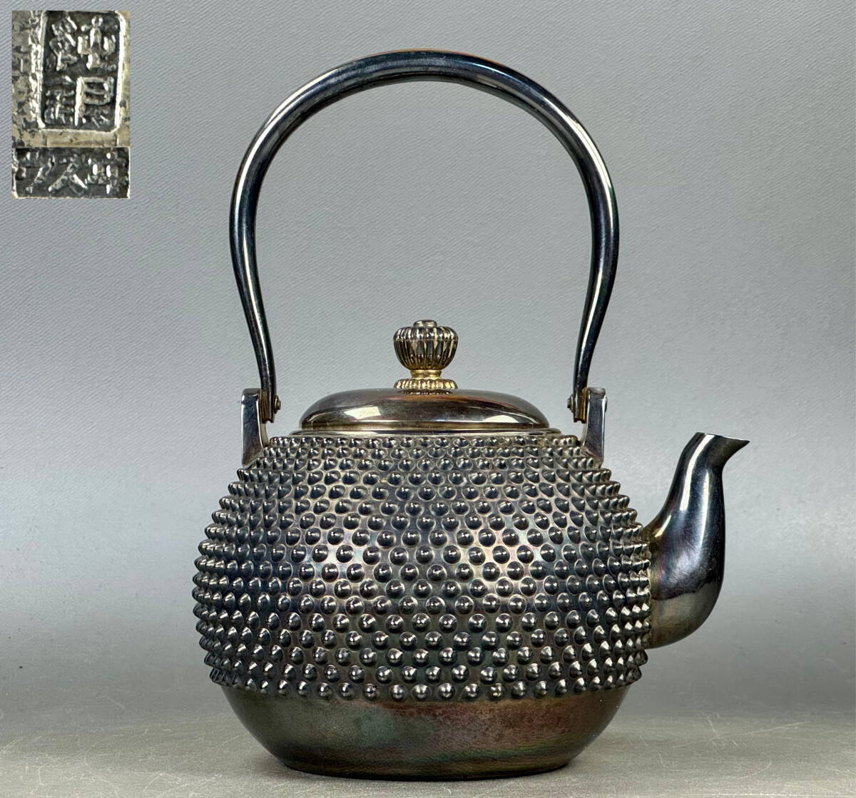 > 【偲】純銀製 霰文銀瓶 刻印 ウスヰ製 湯沸 急須 小振 銀壺 銀器 金属工芸 古美術 時代物 煎茶道具 重:557g 高さ約20㌢ k-135