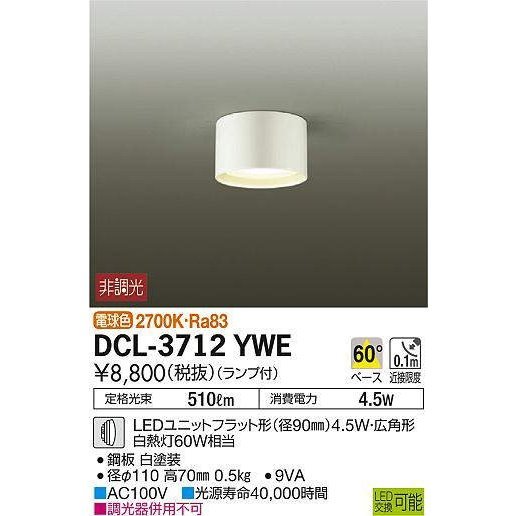 - 【DAIK】ダイコー DCL-3712YWE LEDシーリングライト 電球色 ランプ付き 50/60Hz 100V専用 キッチン 玄関 廊下 トイレ