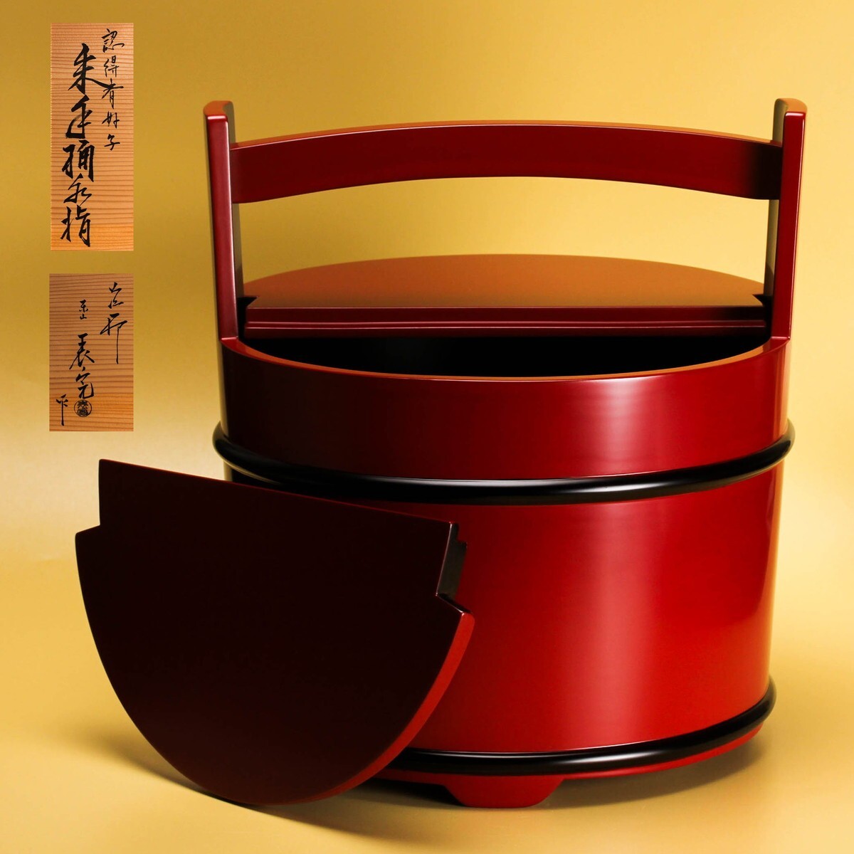 - 三代 川瀬表完 認得斎好写朱手桶水指 未使用と思われる美品 共箱 共布袋 栞 茶道具 本物保証