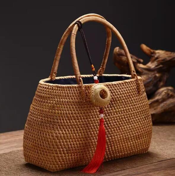 - 高級竹編細工美品 竹編み上げ カゴバック 手作りバスケット お洒落買い物カゴ 収納バッグ デザイン