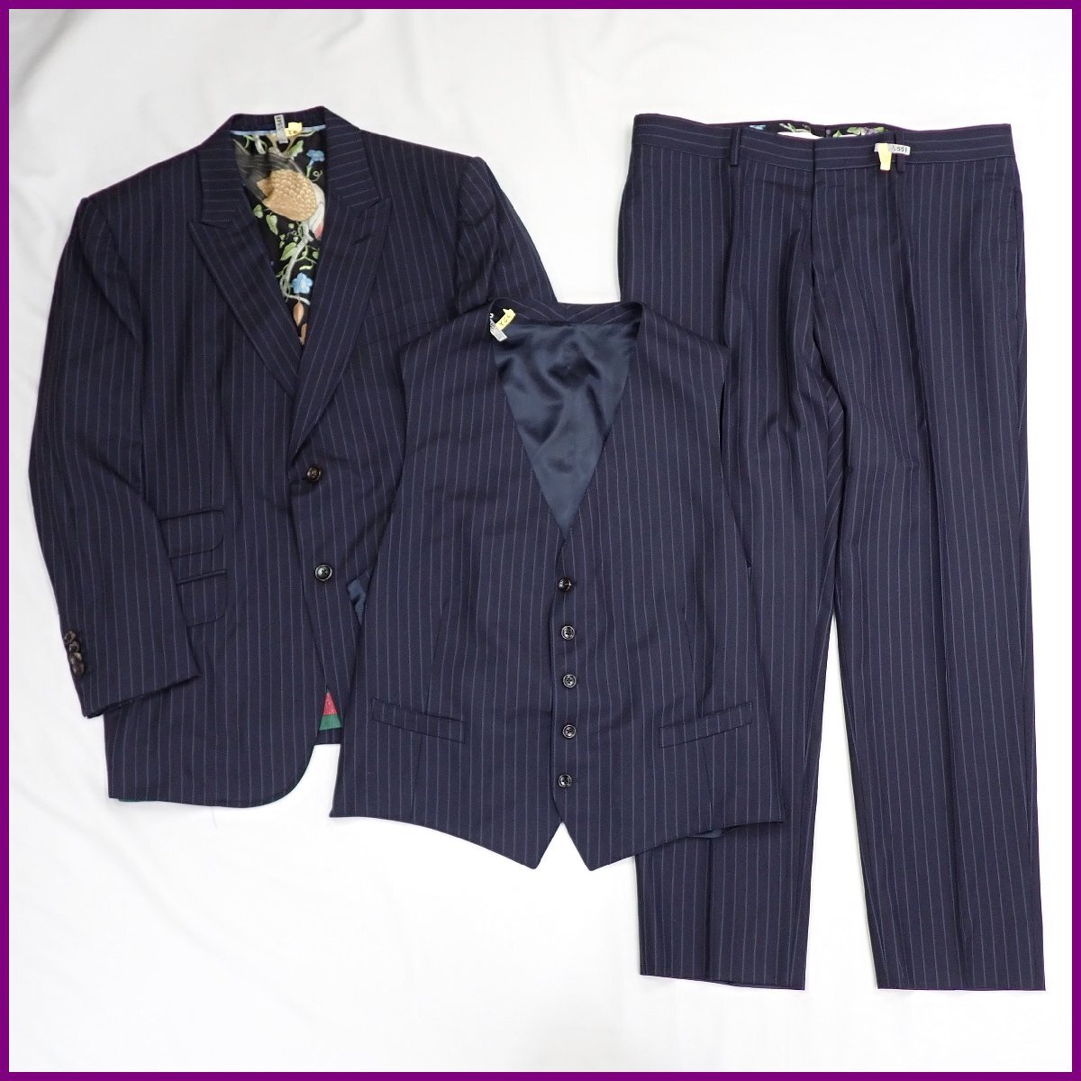 > ★一部美品 GUCCI/グッチ DIY 3ピーススーツ 7-54R・56R/メンズL~LL相当/ネイビー/ストライプ/ボタニカル裏地/ウール100%&2167100047