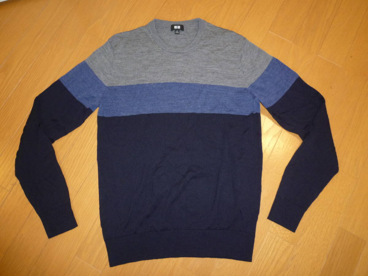 > USED ユニクロ ストライプデザイン 長袖クルーネックニットセーター グレーネイビー M ウール 351-409406