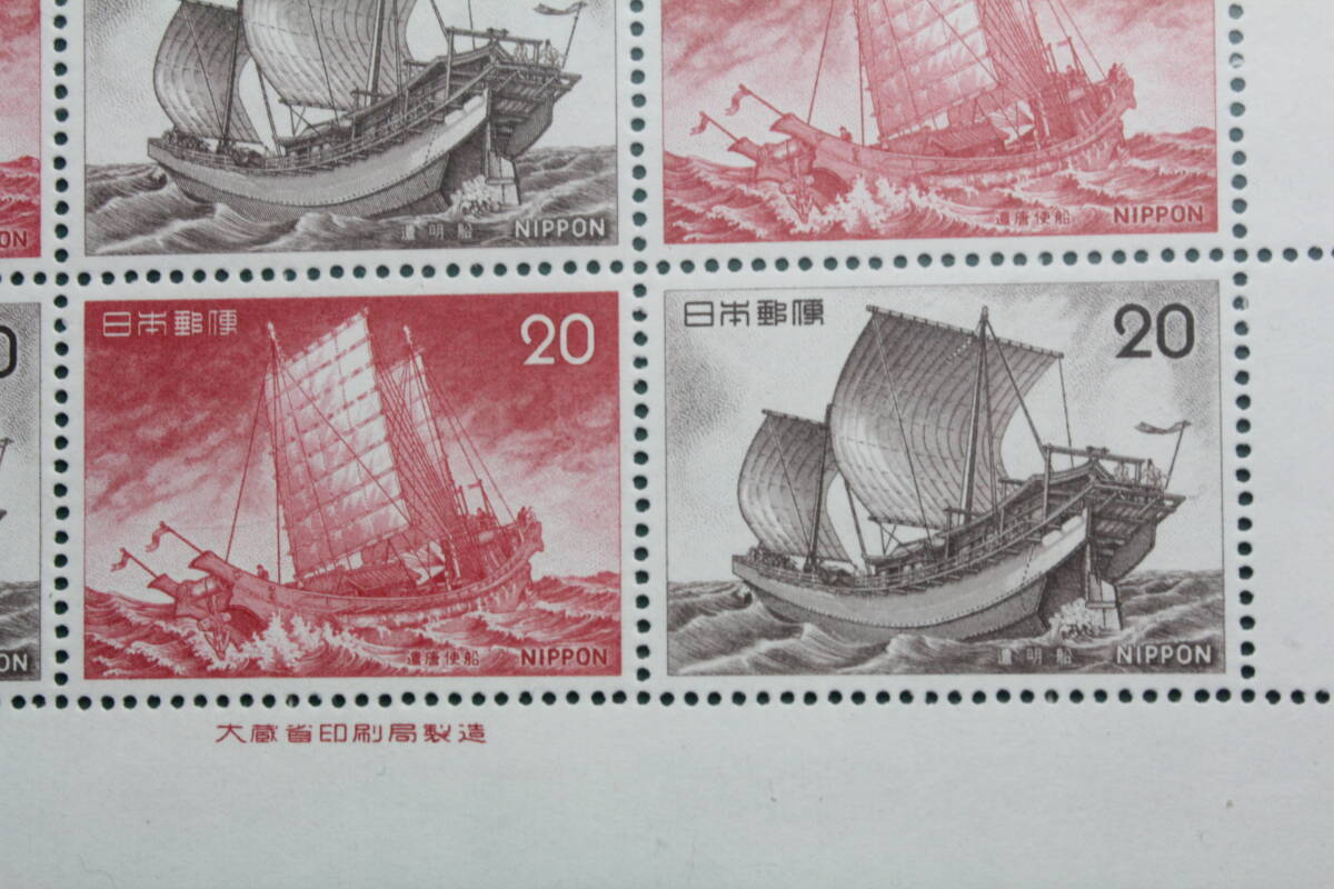 - 〇未使用20円切手のシート1枚 1975年発行 船シリーズ 第1集 遣唐使船/遣明船