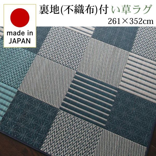 - 純国産京刺子柄い草ラグ merk メルク 不織布あり 261×352cm ブルー