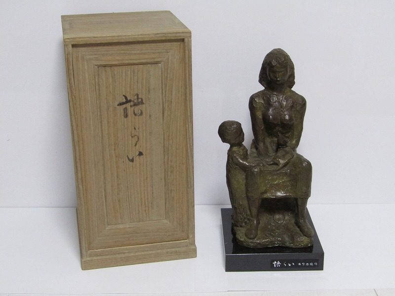 > 古賀忠雄 作 ブロンズ 彫刻 「語らい」共箱 高さ29cm 重さ3.8kg 大理石台付き オブジェ 置物 母子猫 ij24-8395[GGG]