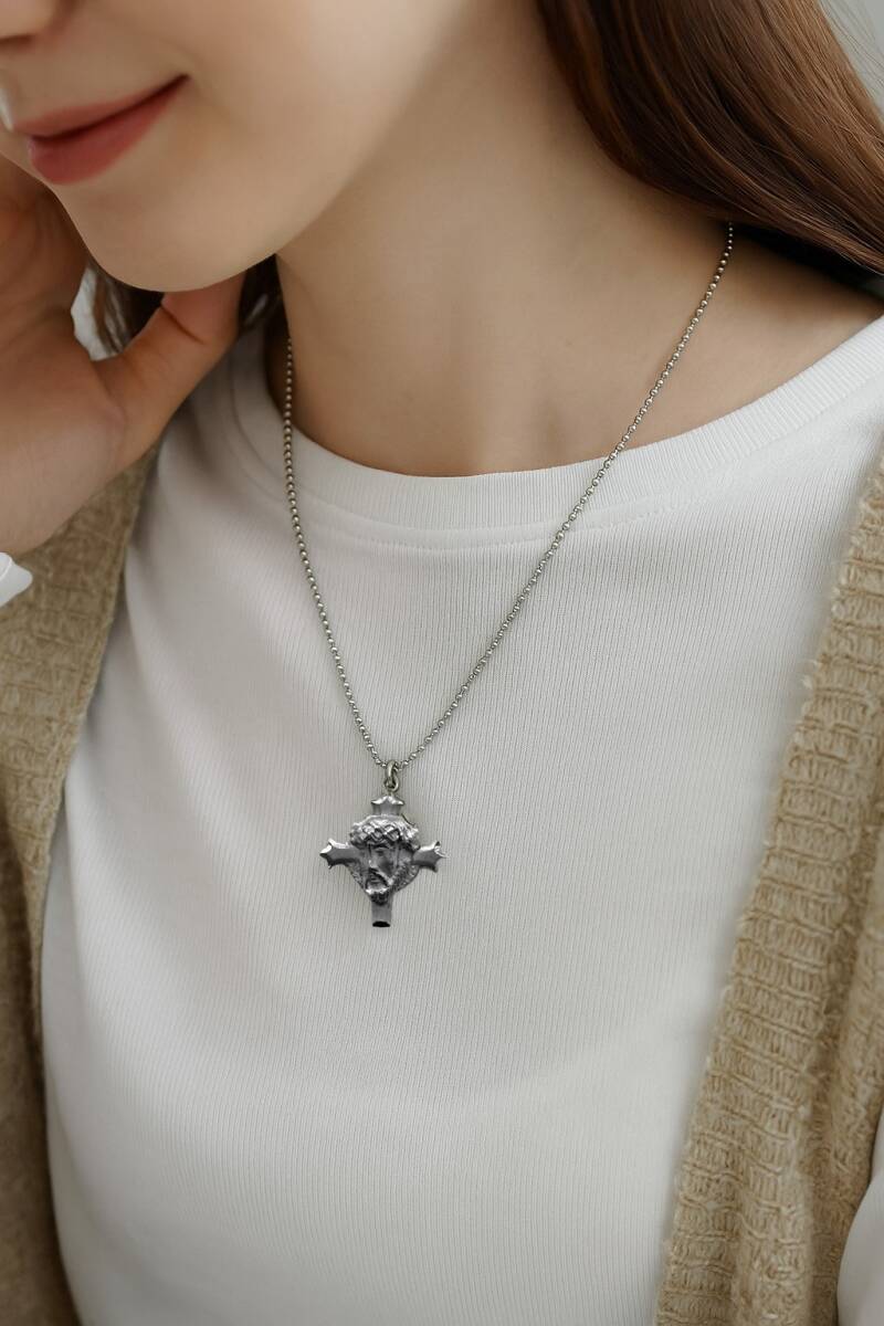 > キリストの顔 十字架 宗教モチーフ 925 シルバー ヴィンテージ クロス ペンダント ネックレス 銀 イタリア製ボールチェーン付 Y13-K