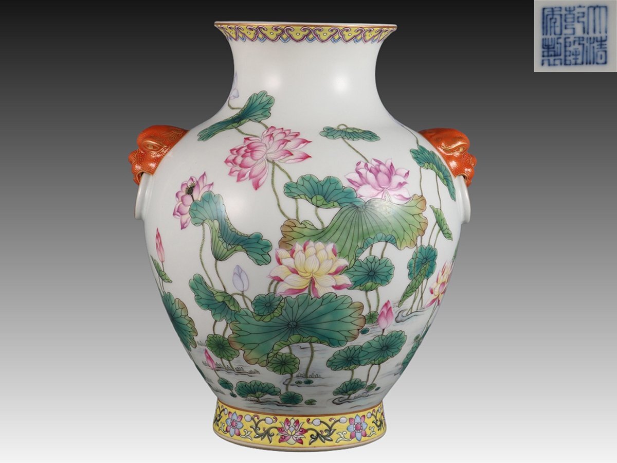 > 【安】清時代 大清乾隆年製 粉彩荷花紋獣耳羅漢尊瓶 共箱 唐瓷 古陶瓷 古美味 中国古美術 古董品 225