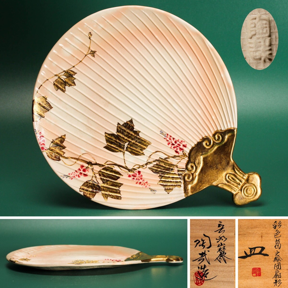 - 澤村陶哉 幅23cm 彩色葛之絵団扇形皿 共箱 共布 本物保証