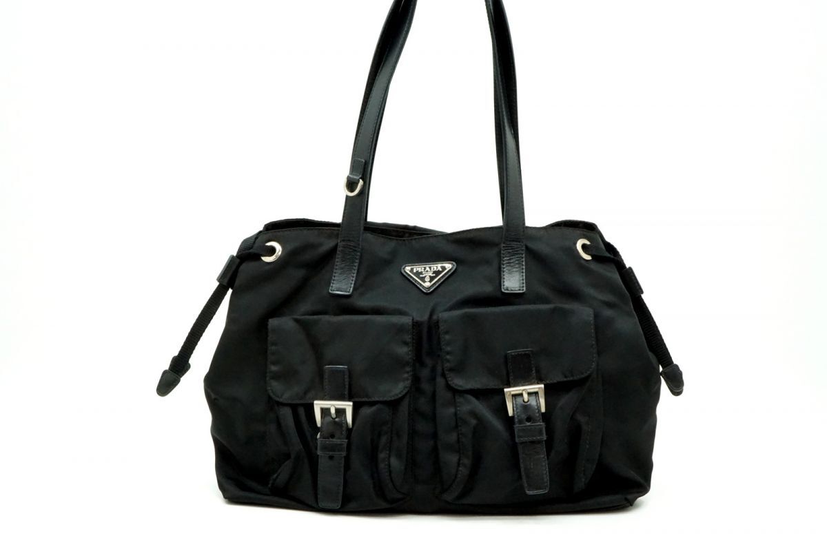 > プラダ ショルダー ハンドバッグ トート 外側ポケット 三角ロゴプレート テスートナイロン 黒 ブラック PRADA 3723h