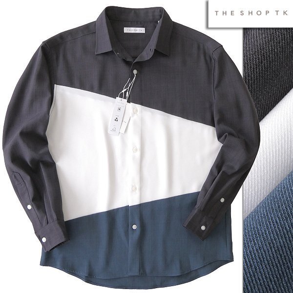 > 新品 タケオキクチ 防シワ ウォッシャブル カルゼ 長袖 シャツ L 濃灰 白 青 【I43522】 THE SHOP TK メンズ 吸水速乾 オールシーズン