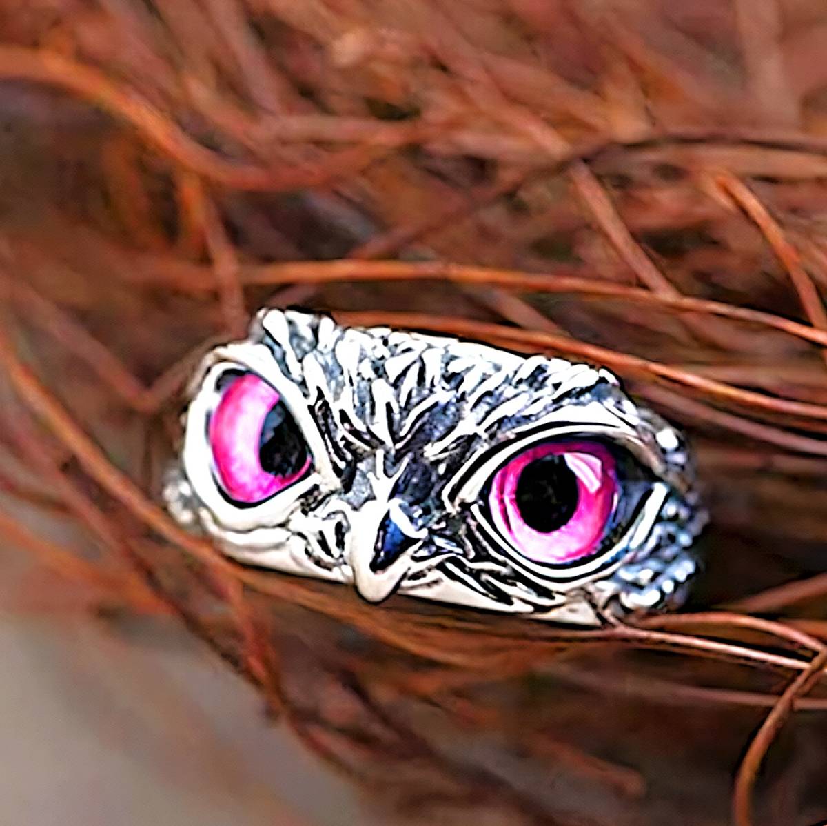 - 新品★送料無料★フリーサイズ視線動く桜色瞳ピンク光 幸運フクロウ梟925シルバーリング 誕生日プレゼント旅行連休秋祭ギフト国内発送