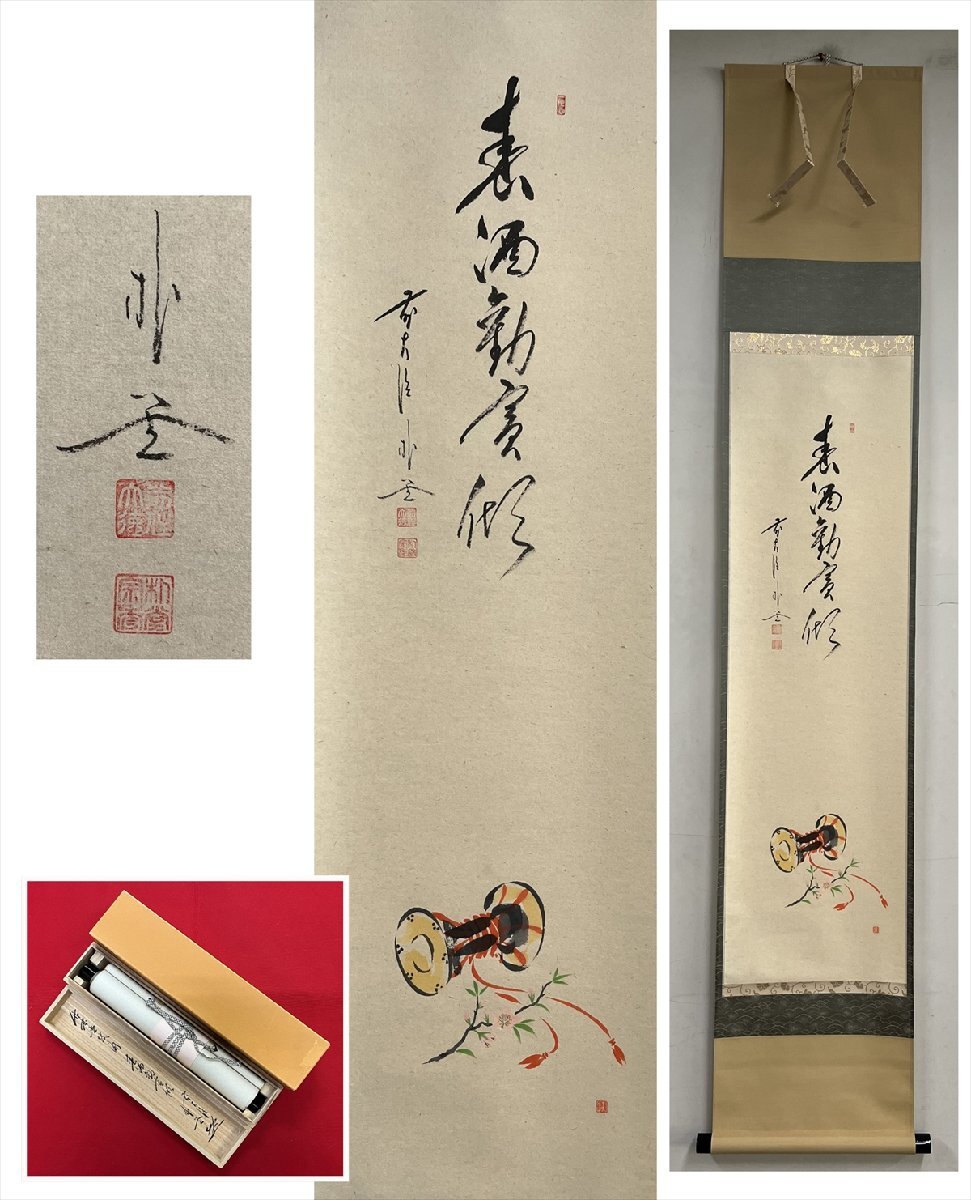 > 【千寿】大徳寺派 福聚院 佐藤朴堂 春酒勤賓傾 鼓画賛 紙本 d1666◆共箱 在銘 季節掛 茶掛 掛軸 掛物 茶道具 100041357