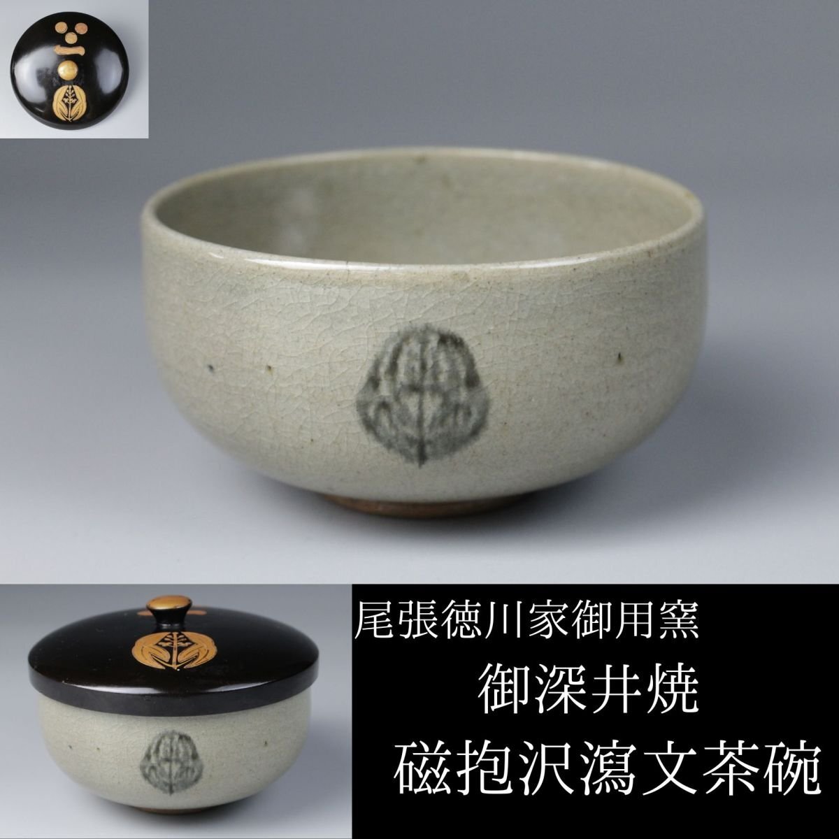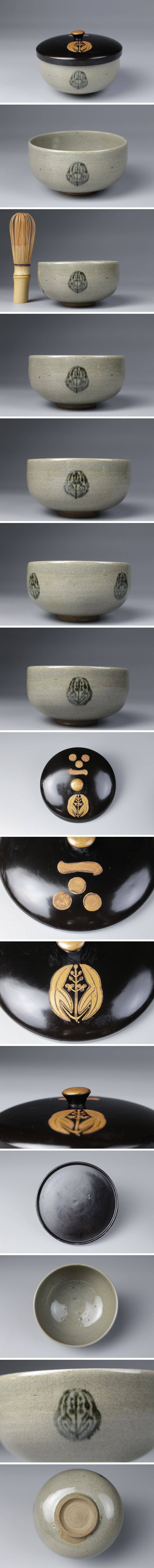 > 【LIG】尾張徳川家御用窯 御深井焼 青磁抱沢瀉文茶碗 毛利家家紋蓋 古美術品 御庭焼 コレクター収蔵品 [.QQ]25.09