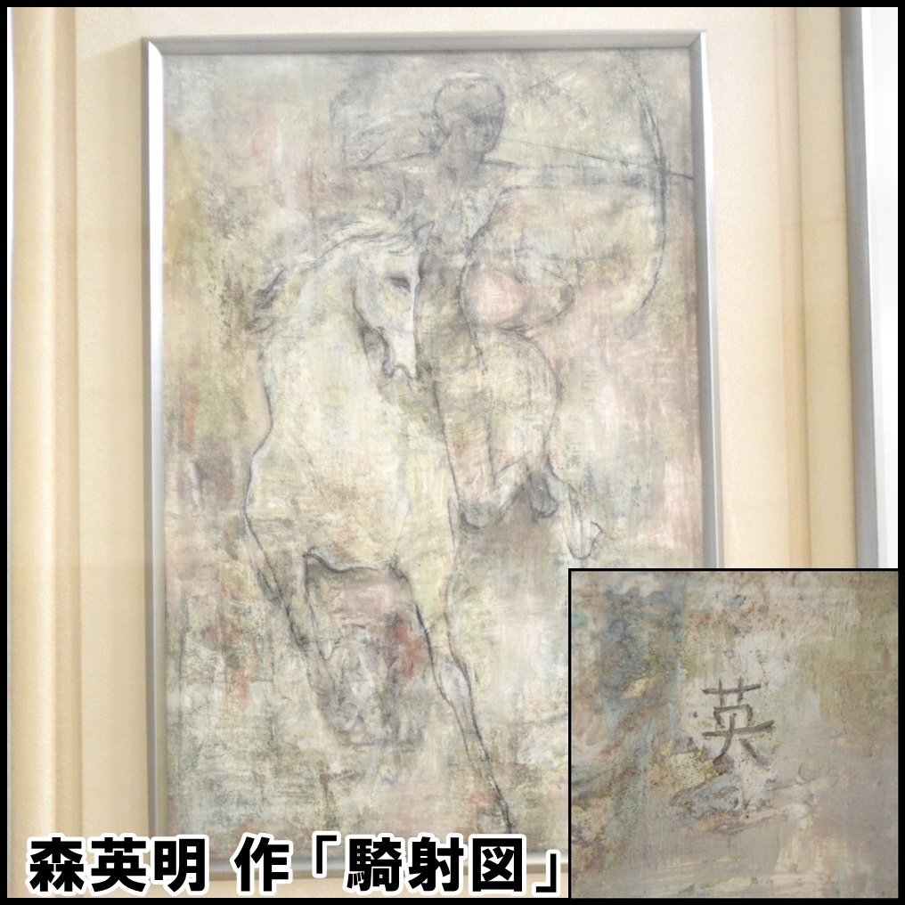 > 保管品 森英明 作 「騎射図」日本画 サイン入り 額外寸約横46cm×縦60cm 画本体寸法横約26.5×縦約40cm 絵画 画家 版画